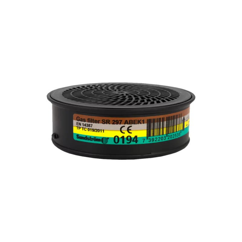 Der Gasfilter SR 297, Klasse 1, ist für die Verwendung mit Sundström-Halb- und Vollmasken vorgesehen. Der Filter ist vom Typ ABEK und schützt vor den folgenden Arten von Gasen/Dämpfen: Typ A schützt vor organischen Gasen und Dämpfen, Lösungsmitteln, deren Siedepunkt über +65 °C liegt. Typ B schützt gegen anorganische Gase und Dämpfe wie Chlor, Schwefelwasserstoff und Cyanwasserstoff. Typ E schützt gegen saure Gase und Dämpfe wie Schwefeldioxid und Fluorwasserstoff. Typ K schützt vor Ammoniak und bestimmten Aminen wie Ethylendiamin. Die Gasfilter können problemlos mit den Partikelfiltern SR 510 P3 R kombiniert werden, um auch gegen Aerosole (Partikel) zu schützen, z. B. beim Spritzlackieren.