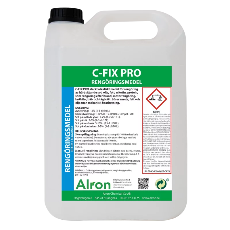C-Fix PRO ist ein hochalkalisches Reinigungsmittel in Konzentratform für die effektive Grobreinigung im Maschinenbau, in der Automobilindustrie und im professionellen Sanitärbereich. C-Fix PRO wurde speziell für die Rußentfernung entwickelt, ist aber ebenso wirksam bei der Auflösung und Reinigung von Oberflächen aus verbranntem Fett, Eiweiß, Öl und eingedrungenem Schmutz, ohne größere mechanische Bearbeitung. Das Mittel ist unparfümiert und eignet sich ideal für die Fälle, in denen eine Geruchsveränderung nicht erwünscht ist, z. B. bei Brandschäden, Nikotinschäden usw.