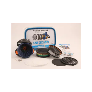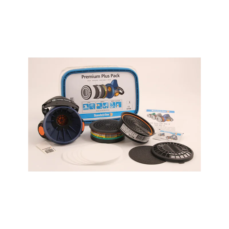 A mask and filter package from Sundströms containing: 1 half mask SR 100 M/L, 1 particle filter SR 510 P3 R, 1 gas filter SR 297 ABEK1, 5 pre-filters SR 221, 1 test disk, 1 prefilter holder, 1 cleaning wipe and user manual with care instructions