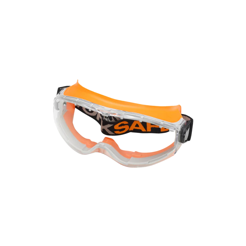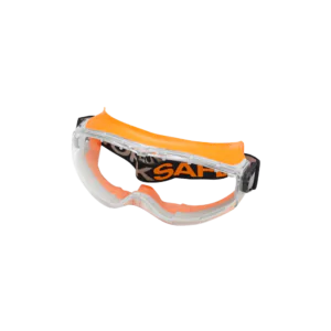 Safety glasses with an extremely wide field of view and exceptional comfort. The combination of two different materials—a hard polycarbonate lens and a soft seal that conforms to the shape of the face—provides complete side protection, even when worn over prescription glasses.