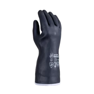 El guante es una mezcla de neopreno. El forro es de poliéster tejido sin costuras y resistente a los cortes. El caucho de neopreno es muy resistente a alcoholes, álcalis, ácidos inorgánicos y orgánicos, aceites y grasas.