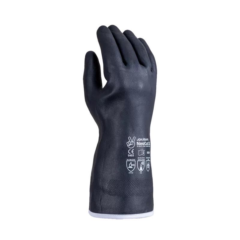 El guante de protección contra cortes Jokasafe NeoCut 33 resistente a productos químicos es un guante de neopreno que se adapta perfectamente a la mano y es flexible. Proporciona una buena protección contra diversos productos químicos. Clase de protección contra cortes 3/D. El guantelete extendido protege la parte de la muñeca de la mano y la ropa. Buen agarre y agradable de usar.